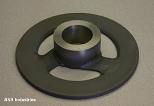 Still in test as an experimental coating to this current ASB customer the coating performance will be monitored for wear. The thermal sprayed Mixing Impeller is being compared to an uncoated tool steel impeller-already showing wear. The operating condition is mixing of a dry material. ASB applied the carbide coating by the HVOF process with care taken to apply consistent thickness on all areas of the Mixing Impeller. A noted benefit is the non magnetic coating and substrate of the ASB processing is proving to increase quality of the finished customer product.